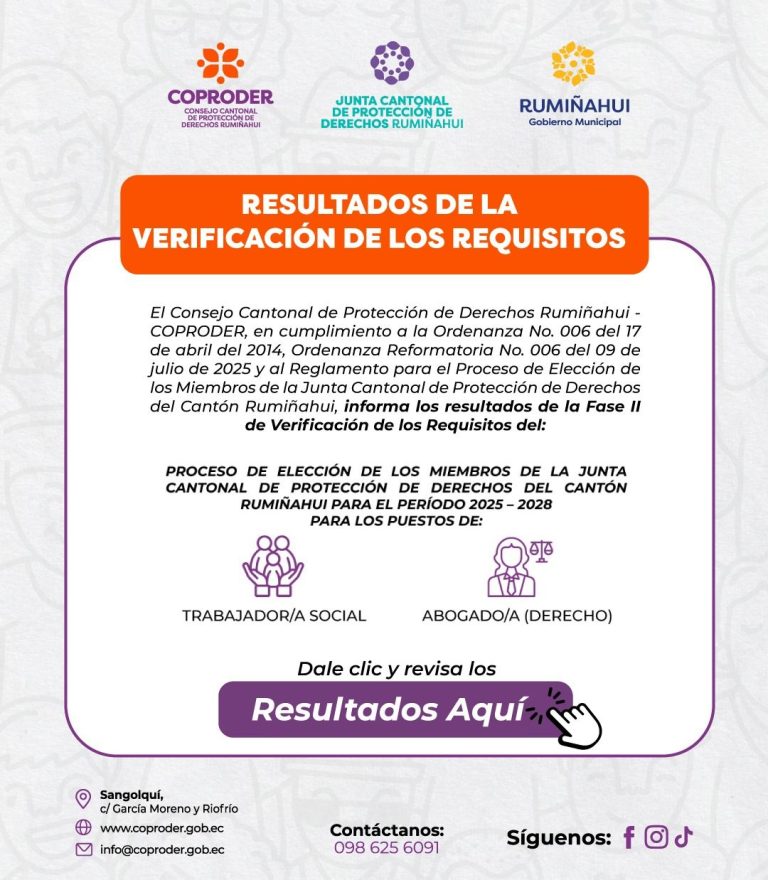 El Consejo de Protección de Derechos de Rumiñahui (COPRODER) articula acciones con otras instituciones para asegurar la protección de estos derechos. Salvaguarda los derechos de grupos vulnerables, incluyendo niños, adolescentes, mayores y discapacitados, así como mujeres embarazadas y víctimas de violencia. Además, atiende a personas en movilidad humana y a aquellos en situaciones de riesgo en el cantón Rumiñahui.