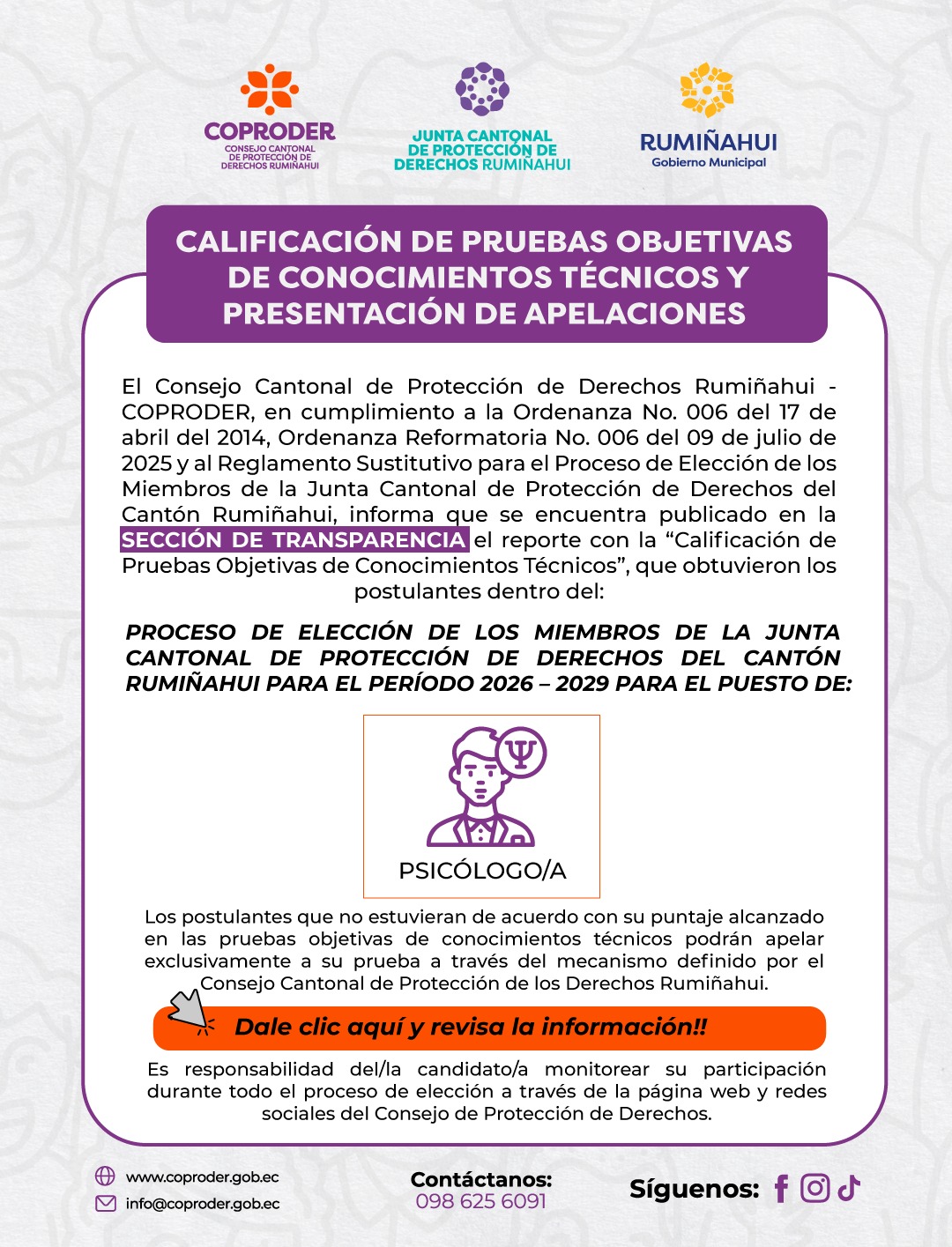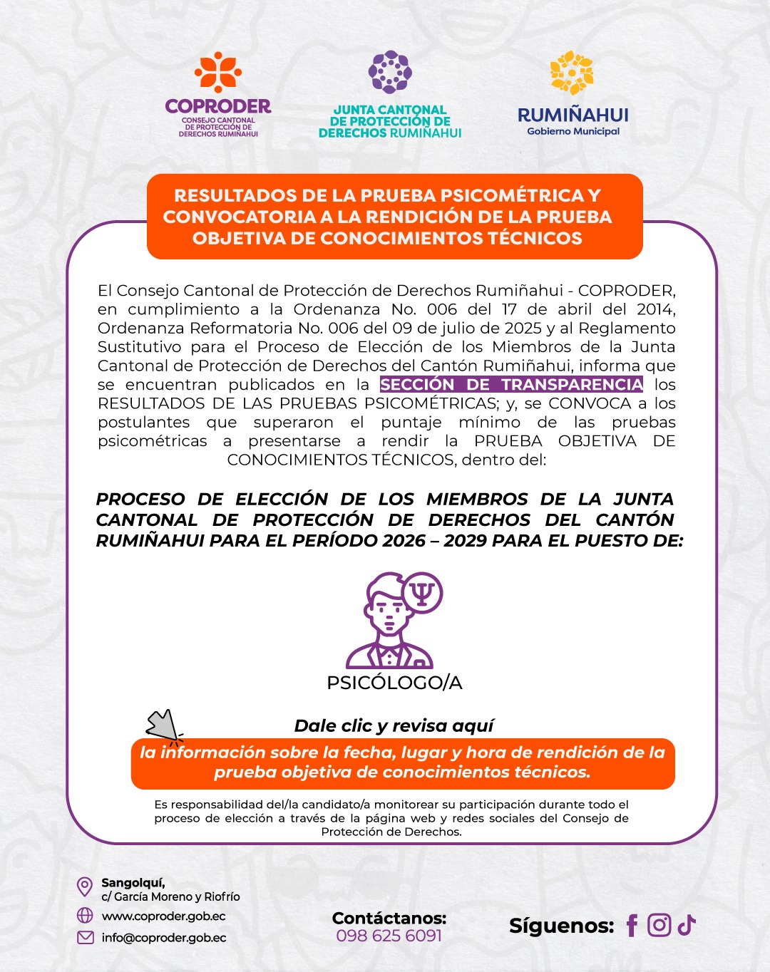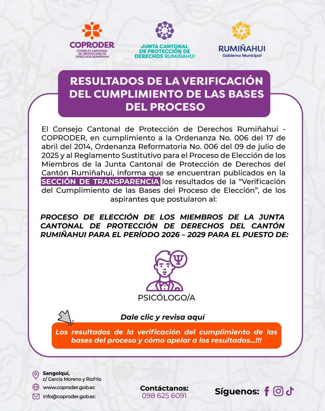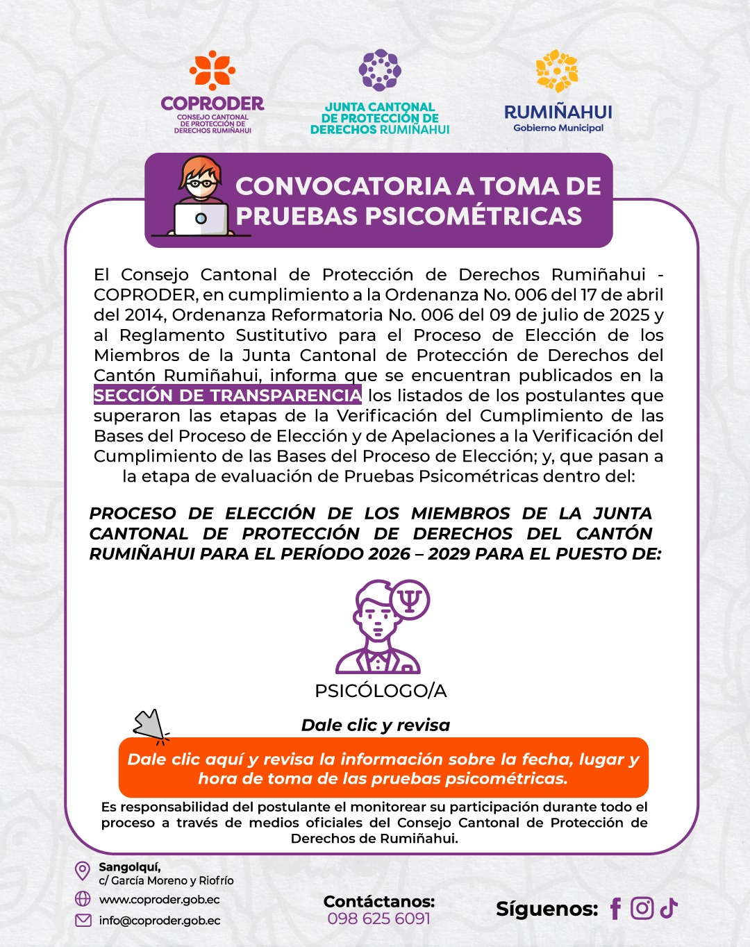 El Consejo de Protección de Derechos de Rumiñahui (COPRODER) articula acciones con otras instituciones para asegurar la protección de estos derechos. Salvaguarda los derechos de grupos vulnerables, incluyendo niños, adolescentes, mayores y discapacitados, así como mujeres embarazadas y víctimas de violencia. Además, atiende a personas en movilidad humana y a aquellos en situaciones de riesgo en el cantón Rumiñahui.